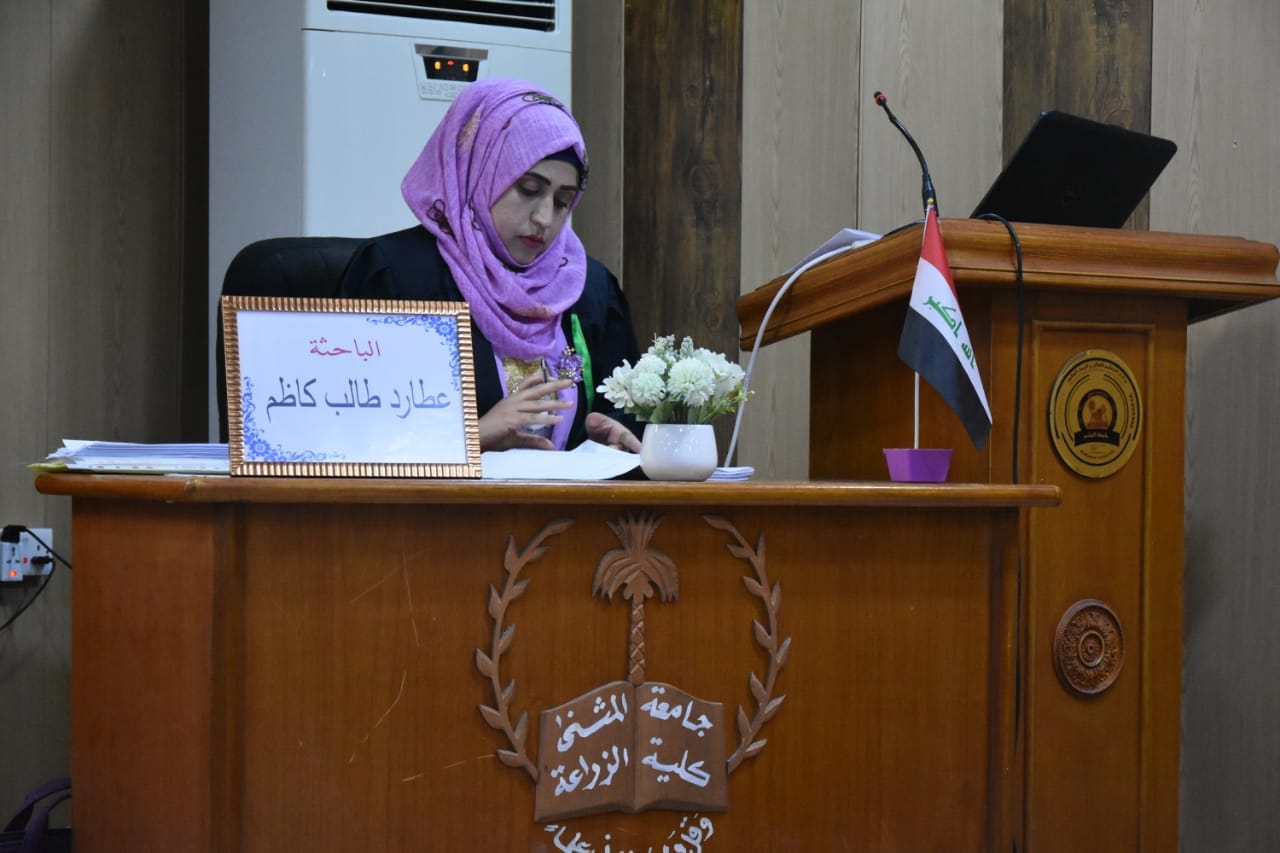 05/08/2022This morning, Thursday, 4/28/2022, a discussion took place in Jaber bin Hayyan Hall at the College of Agriculture, University of Al-Muthanna.. The discussion of the master’s student (Mercury Talib Kazem) tagged (irrigation scheduling and levels of NPK mineral and nano fertilizers for eggplant under greenhouse conditions)