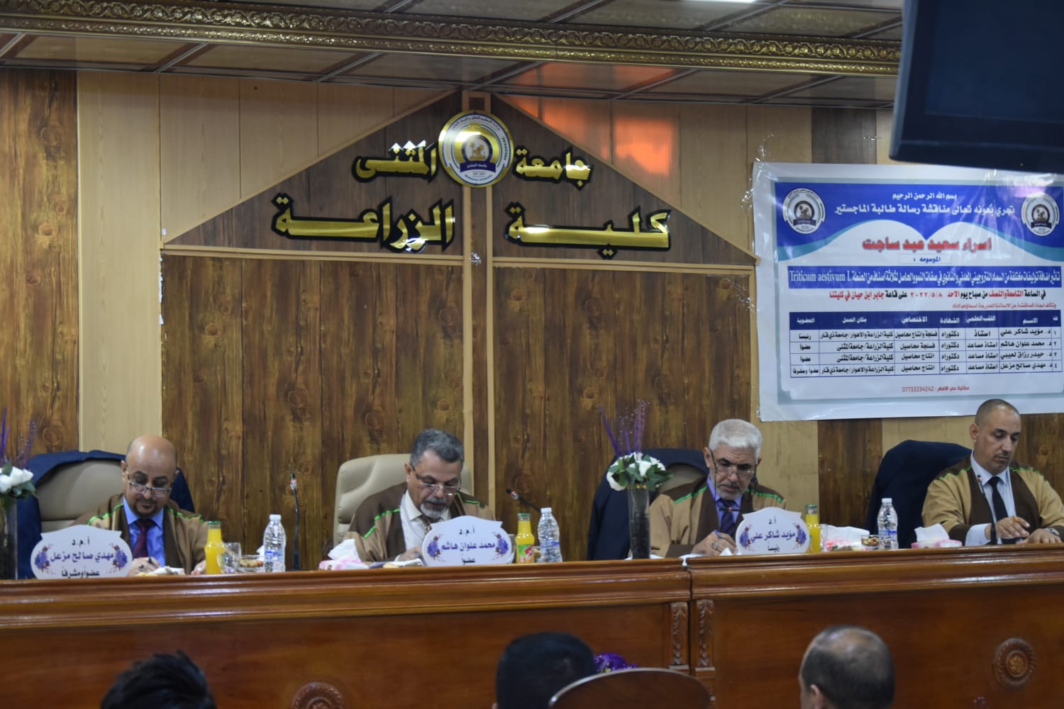 05/09/2022This morning, Sunday, May 8, 2022, it took place in Jaber Bin Hayyan Hall in the College of Agriculture, University of Al-Muthanna.. A discussion of the thesis of the master’s student (Esraa Saeed Abed Sajet) Department of Field Crops and Labeled (The effect of adding different combinations of mineral and secondary nitrogen fertilizers on growth characteristics The result is for three varieties of wheat (Triticum aestivum L) .. After an in-depth and extensive discussion, the thesis was approved and with a grade of distinction … Congratulations to the student, her supervisor, and the members of the discussion committee.