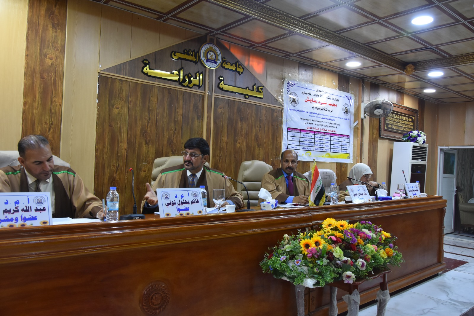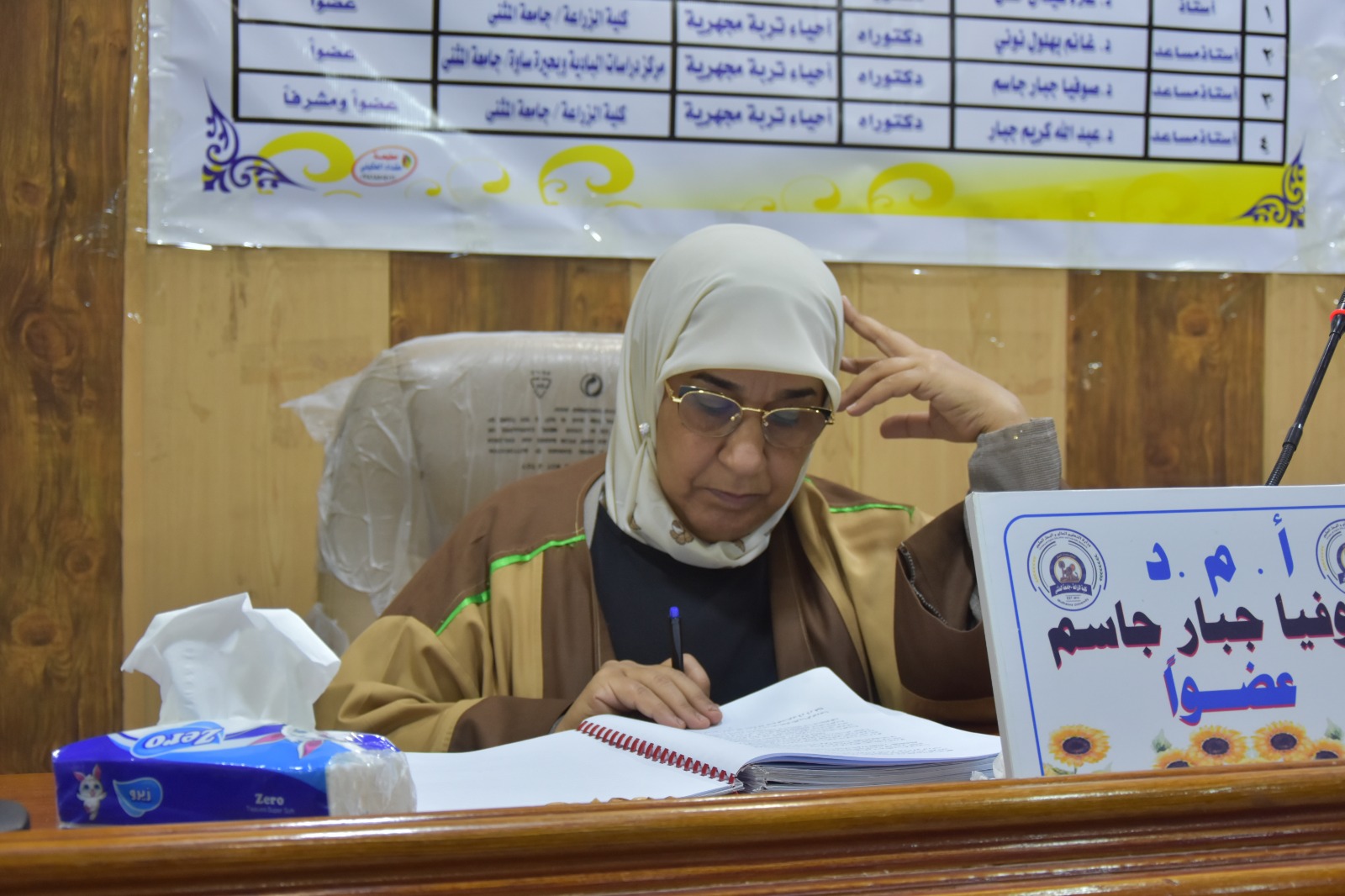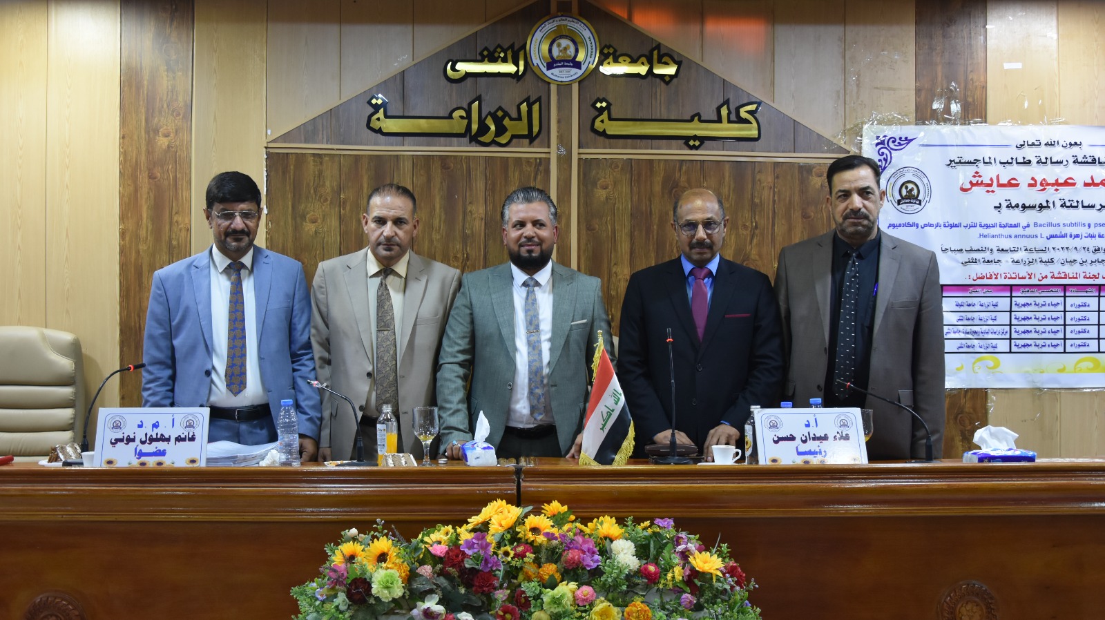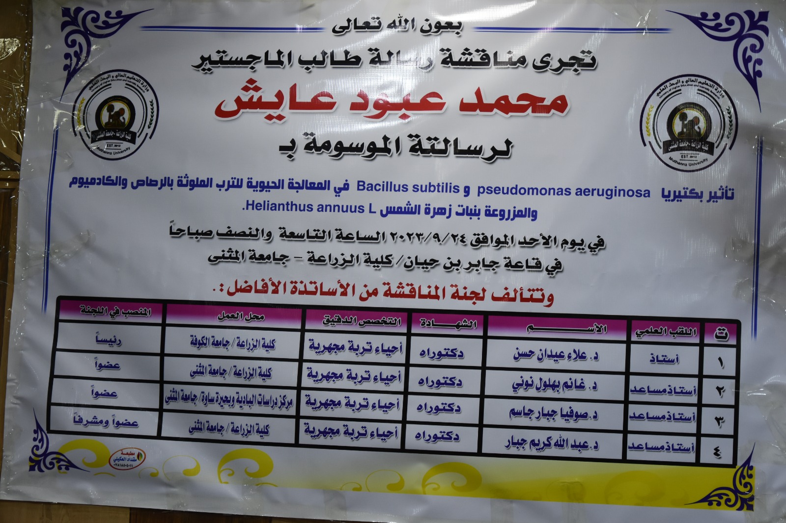 ناقشت كلية الزراعة جامعة المثنى رسالة الماجستير لمناقشة ر والموسومة ( تاثير بكتريا Pseudomonas aerugonosa و Bacilus subtilis في المعالجة الحيوية للترب الملوثة بالرصاص والكادميوم والمزروعة بنبات زهرة الشمس)