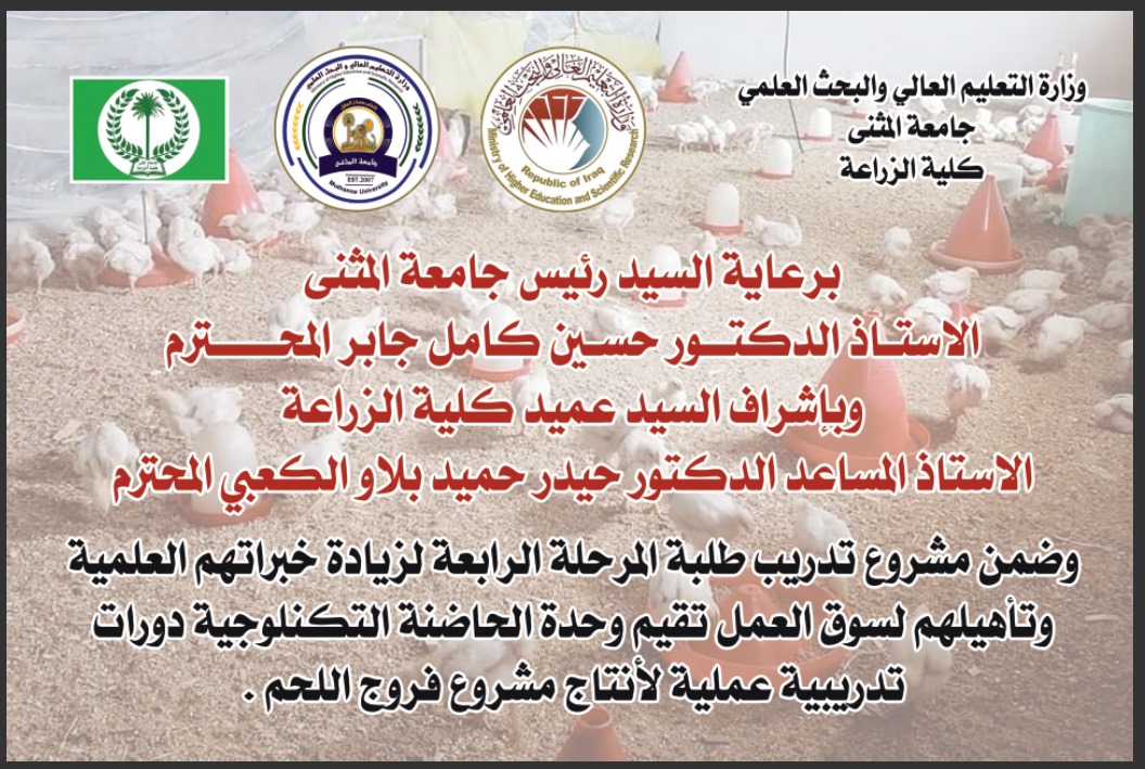 تقيم كلية الزراعة وحدة الحاضنة التكنولوجية مشاريع تدريب طلبة المرحلة الرابعة متمثلة بتربية فروج اللحم في قاعة دواجن محطة الأبحاث والتجارب الزراعية الأولى ومشروع البيوت البلاستيكية في محطة الأبحاث والتجارب الزراعية الثانية، هدف المشروع هو تدريب َتنمية قدرات رواد الأعمال من الخريجين والطلبة وتأهيلهم لسوق العمل.