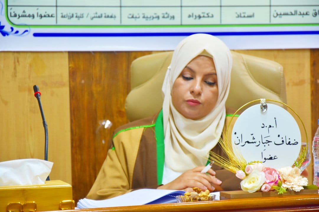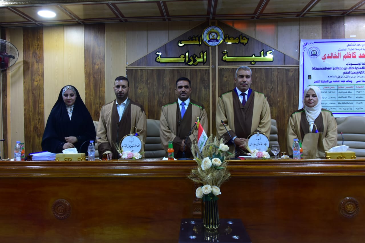 أجريت اليوم في قاعة جابر ابن حيان _كلية الزراعة مناقشة علنية لرسالة طالبة الماجستير نور عبدالواحد كاظم الخالدي في قسم علوم المحاصيل الحقلية (انتاج نباتي) والموسومة،(تأثير النقع بالكولشيسين على بعض الصفات المظهرية والتشريحية والجزيئية لأربعة أصناف من حنطة الخبز)