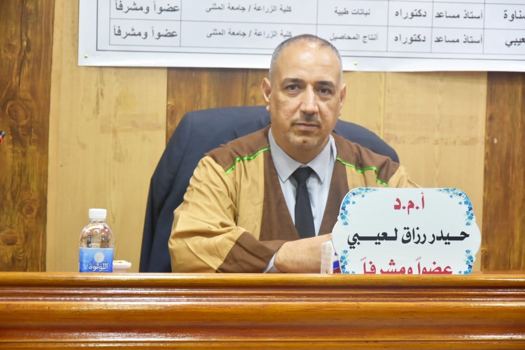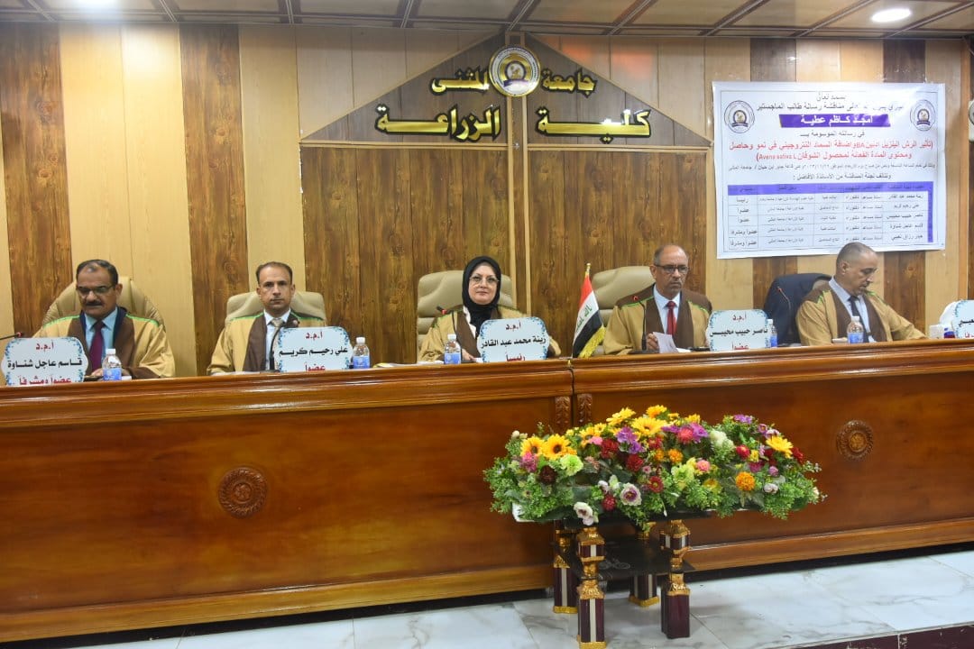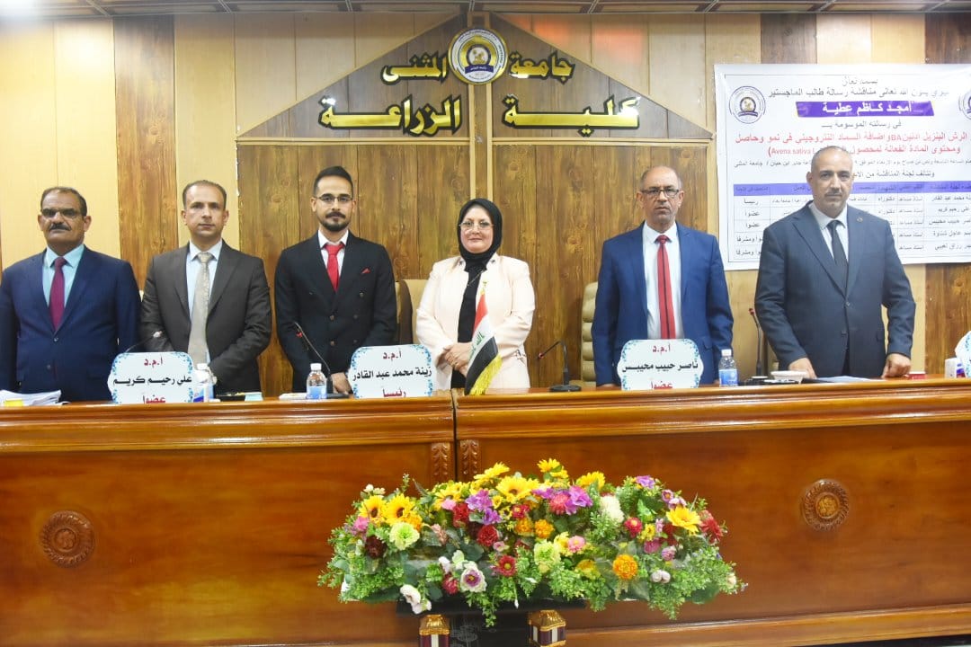 أجريت هذا اليوم الاربعاء الموافق ٢٩/ ١١/ ٢٠٢٣ وفي قاعة جابر بن حيان في كلية الزراعة جامعة المثنى.. مناقشة علنية لرسالة طالب الماجستير امجد كاظم عطية في قسم المحاصيل الحقلية والموسومة(( تأثير رش البنزيل ادنين BA وإضافة السماد النتروجيني في نمو وحاصل ومحتوى المادة الفعالة لمحصول الشوفان . Avena saliva L .