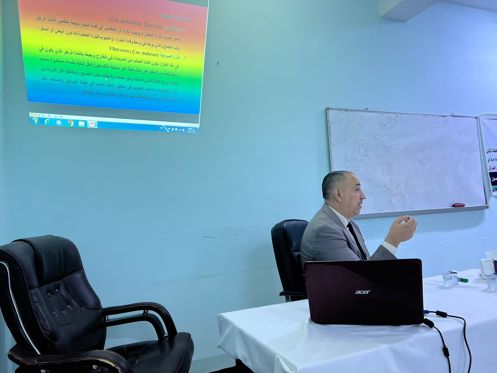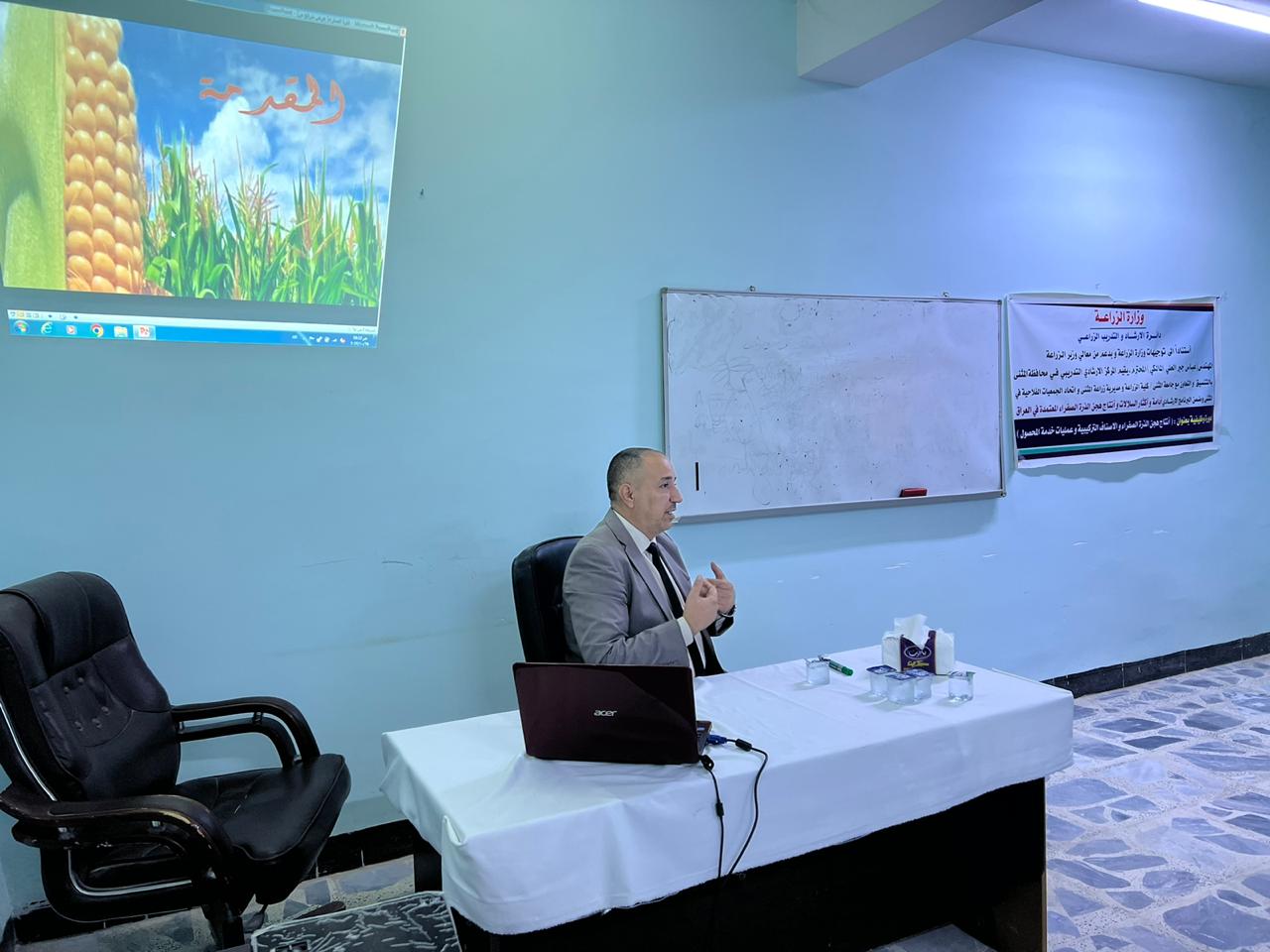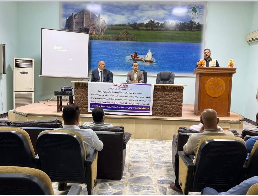 ضمن اطار التعاون العلمي بين كلية الزراعة – جامعة المثنى ودائرة الارشاد الزراعي وبدعوة كريمة من مدير الارشاد الزراعي الدكتور رعد هلاوي وبحضور مديرية زراعة المثنى وبقية الدوائر الزراعية ذات العلاقة تم افتتاح الدورة الوظيفية الخاصة ببرنامج الذرة الصفراء وبعنوان ( انتاج هجن الذرة الصفراء والاصناف التركيبية وعمليات خدمة المحصول ) حيث تم القاء محاضرتين على طول برنامج مدة الدورة من قبل التدريسيين في قسم المحاصيل الحقلية / كلية الزراعة – جامعة المثنى . د . حيدر رزاق لعيبي و د. محمد حسين نور كما تضمن منهاج الدورة زيارة محطة الأبحاث التابعة لكلية الزراعة للتعرف على طرق وعمليات خدمة المحصول للذرة الصفراء .