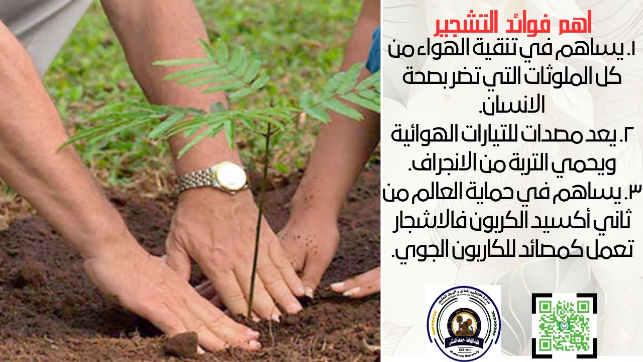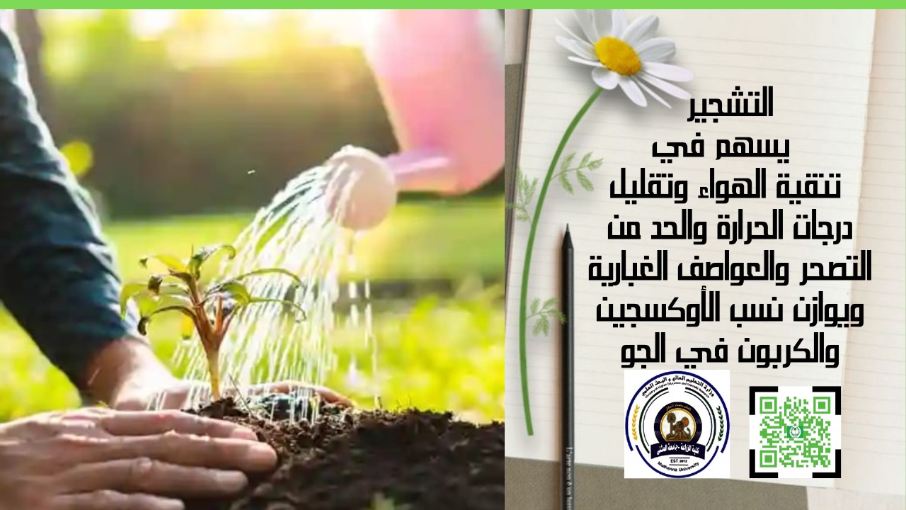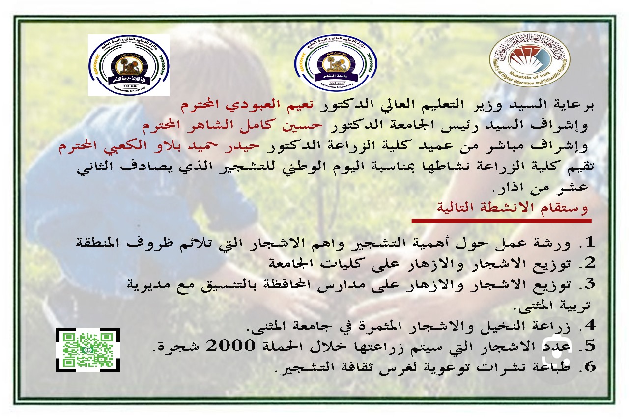 برعاية السيد وزير التعليم العالي الدكتور نعيم العبودي المحترم وإشراف السيد رئيس الجامعة الدكتور حسين كامل الشاهر المحترم وإشراف مباشر من عميد كلية الزراعة الدكتور حيدر حميد بلاو الكعبي المحترم تقيم كلية الزراعة نشاطها بمناسبة اليوم الوطني للتشجير الذي يصادف الثاني عشر من اذار.