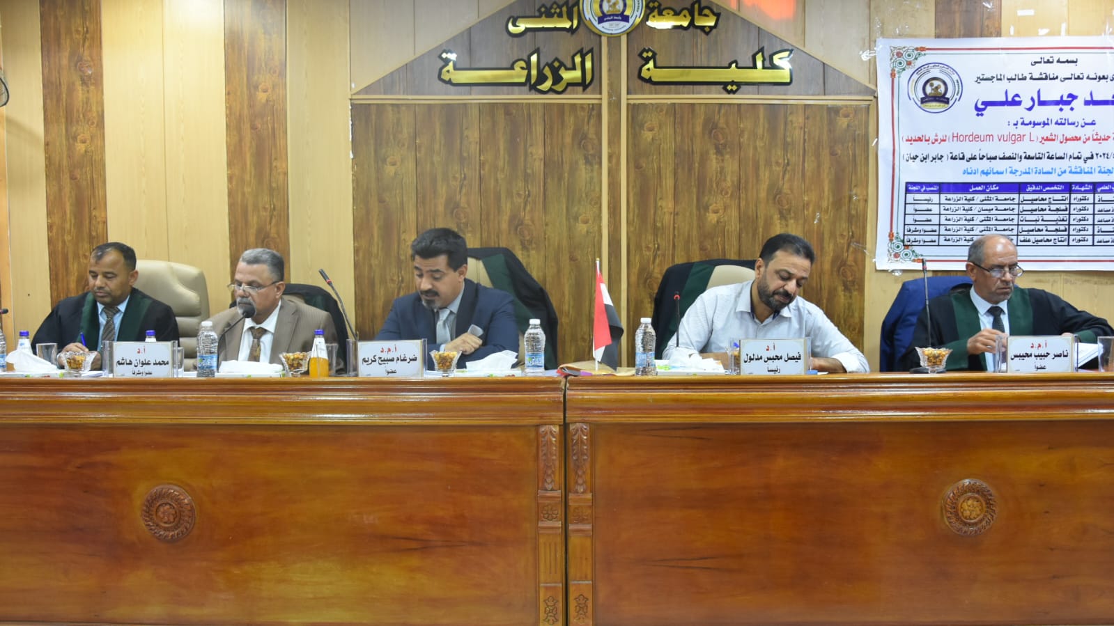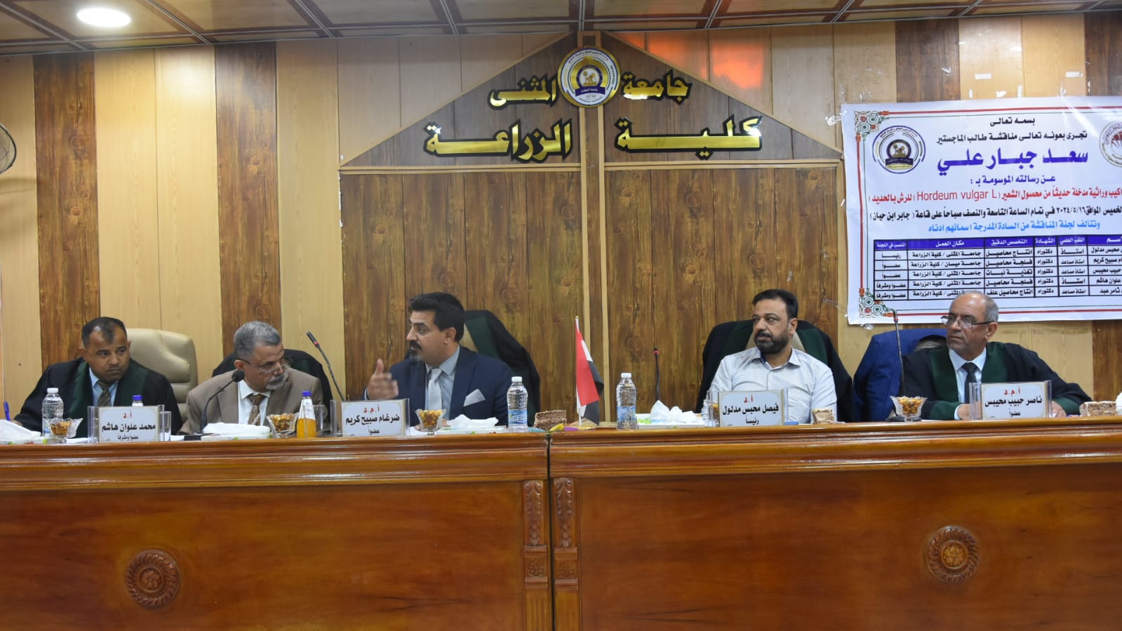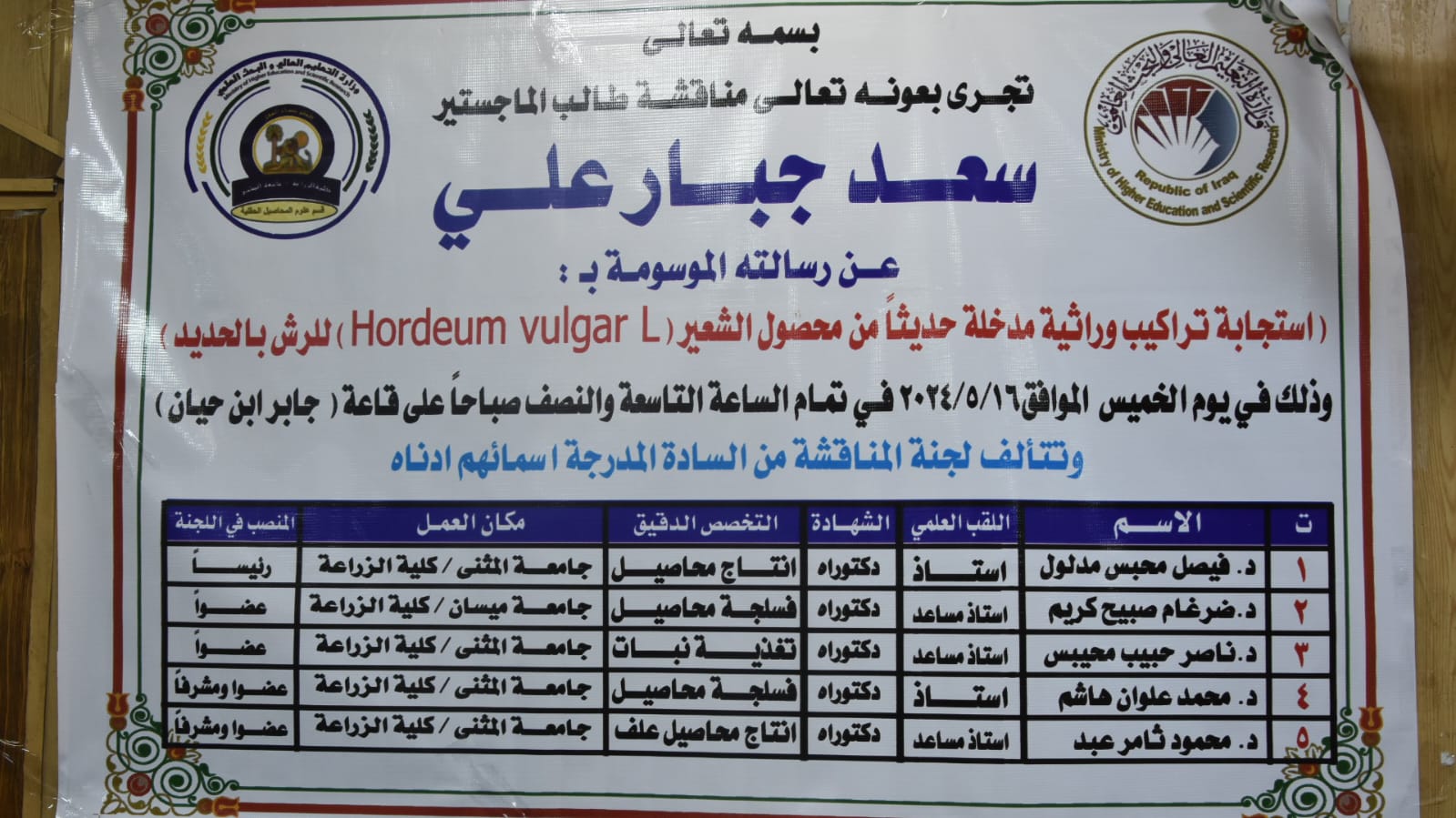 أجريت هذا اليوم الخميس الموافق 5/16/ 2024 وفي قاعة جابر بن حيان في كلية الزراعة – جامعة المثنى.. مناقشة علنية لرسالة طالب الماجستير ((سعد جبار علي )) في قسم المحاصيل الحقلية والموسومة (( استجابة تراكيب وراثية مدخلة حديثا من محصول الشعير)) الرسالة فالف مبروك للطالب واللجنة المشرفه
