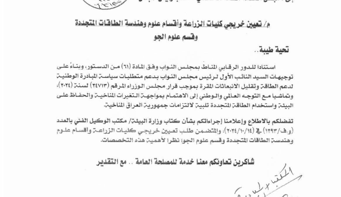 في تطور إيجابي ومبشّر…. باشر مكتب رئيس مجلس الوزراء بمخاطبة مجلس الخدمة الاتحادية بشأن شمول خريجي الكليات الخضراء ومن ضمنها كليات الزراعة بالتعيين المركزي استجابةً لتوصيات مجلس النواب ودعوات الخريجين المتكررة….ويأتي هذا التحرك الرسمي تقديراً لدور التخصصات الزراعية والبيئية في دعم الأمن الغذائي والتنمية المستدامة وإيماناً بأهمية هذه الكفاءات في تطوير القطاع الزراعي والنهوض بالاقتصاد الوطني.