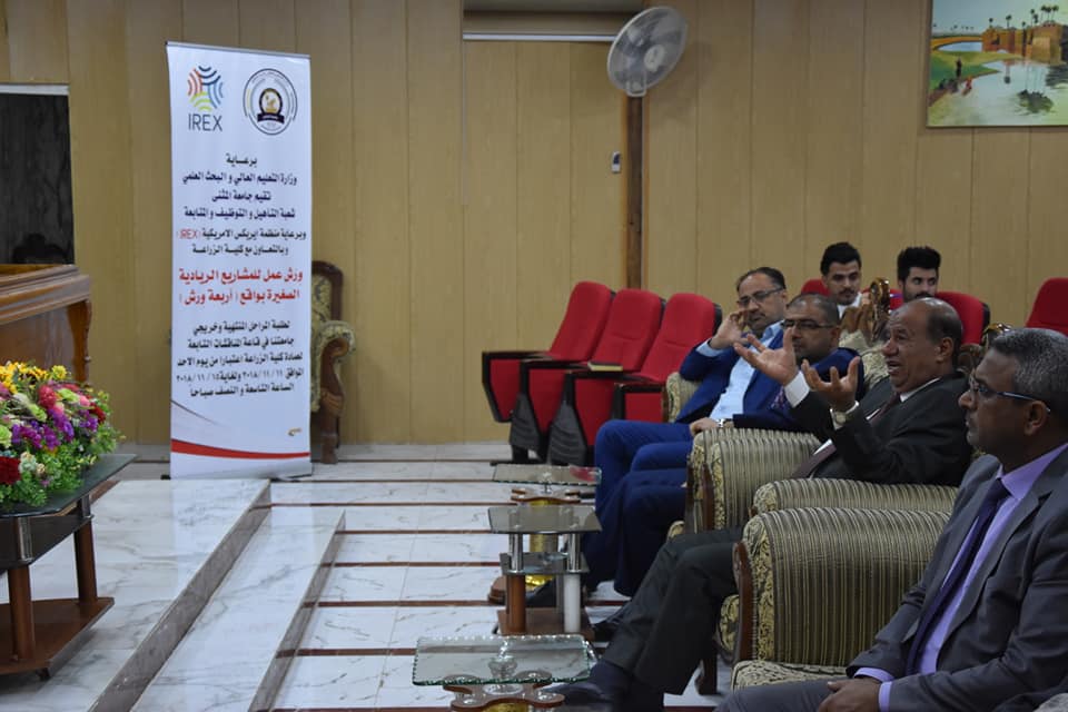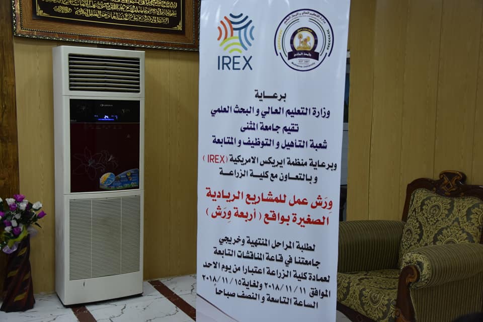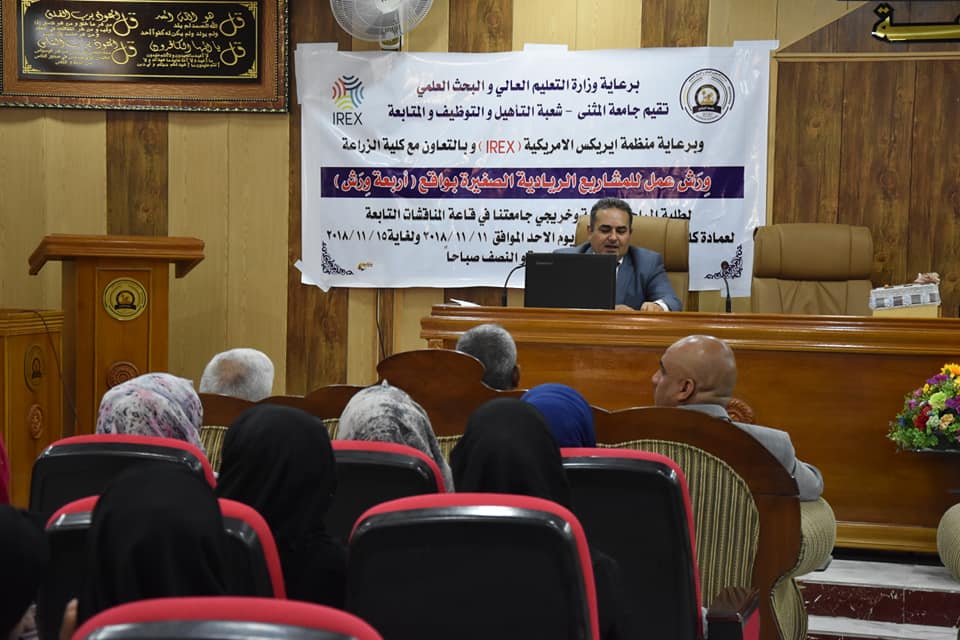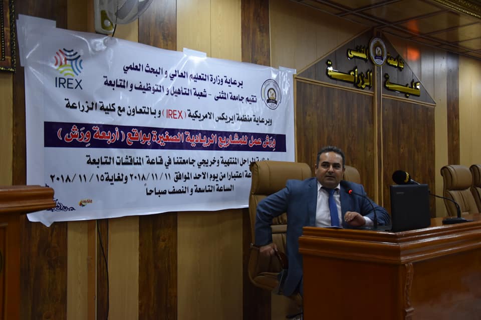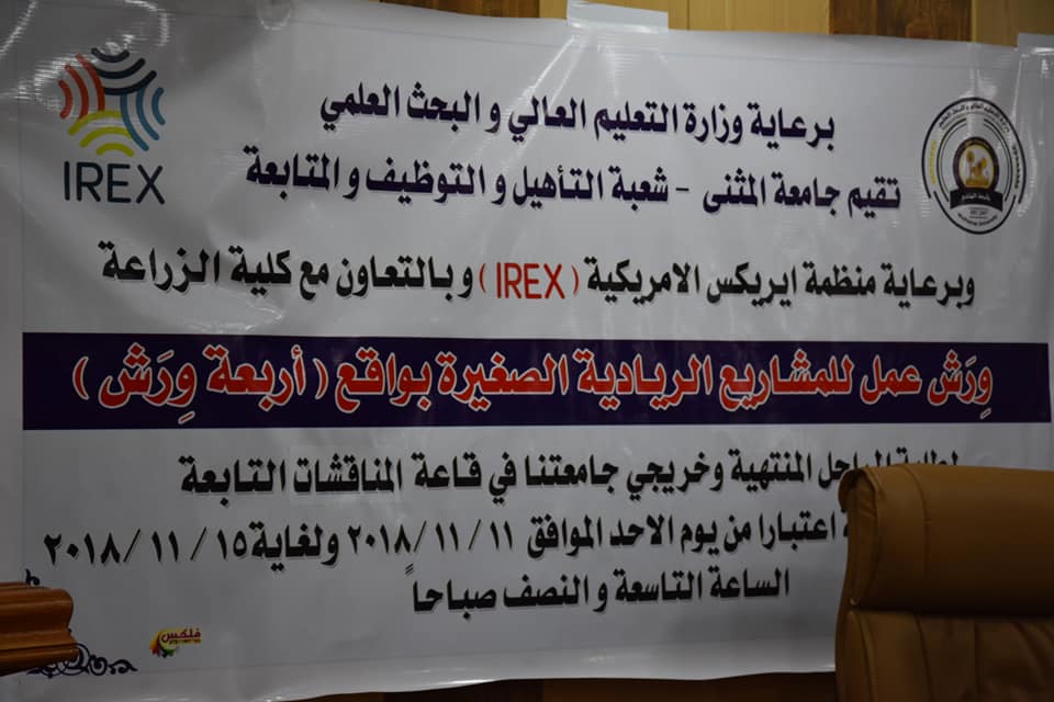 12/30/2018برعاية وزارة التعليم العالي والبحث العلمي تقيم جامعة المثنى شعبة التأهيل والتوظيف والمتابعة وبرعاية منظمة ايريكس وبالتعاون مع كلية الزراعة جامعة المثنى (ورش عمل للمشاريع الريادية الصغيرة بواقع اربعة ورش لطلبة المراحل المنتهية وخريجي جامعتنا وكليتنا وافتتحت ورشة العمل بكلمة للاستاذ نبيل عبد الله مسؤول شعبة التأهيل والتوظيف في الجامعة بين فيها اهمية هذة المشاريع الصغيرة للخريجين وكما القى الاستاذ الدكتور جاسم قاسم مناتي التدريسي في كلية الزراعة جامعة المثنى محاضرة عن طرق وكيفية العمل المشاريع الصغيرة وجرت ورشة العمل على قاعة جابر بن حيان التابعه الى كلية الزراعة جامعة المثنى وتبدا من يوم الاحد ٢٠١٨/١١/١١ ولغاية ٢٠١٨/١١/١٥ بواقع اربعة ورش عمل عن مشاريع متنوعة علما وقت ورشة العمل سيكون في الساعة التاسعة والنصف صباحا