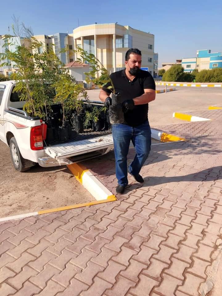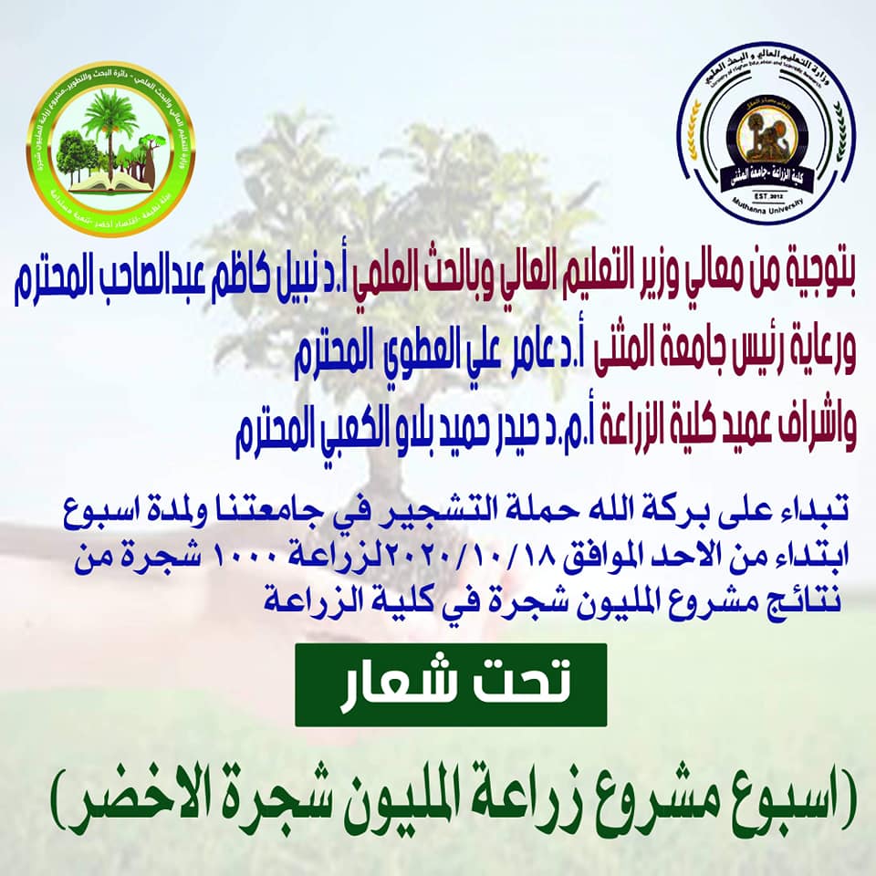 برعاية السيد رئيس جامعة المثنى الأستاذ الدكتور عامر علي حسين المحترم وإشراف السيد عميد كلية الزراعة الأستاذ المساعد الدكتور حيدر حميد بلاو المحترم، وبمشاركة السيد مساعد رئيس الجامعة للشؤون الإدارية المحترم والسادة العمداء الأفاضل، انطلقت صباح اليوم الأحد الموافق ٢٠٢٠/١٠/١٨ حملة تشجير واسعة في جامعة المثنى ولمدة أسبوع لتحقيق أهداف مشروع المليون شجرة بجعل الجامعات مساحات خضراء ومصائد كاربون.