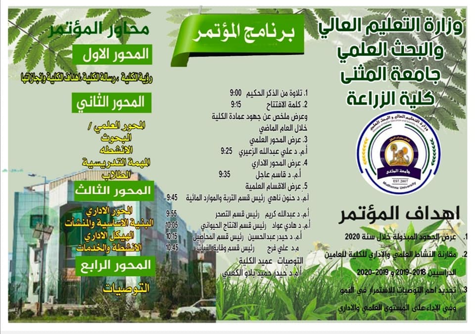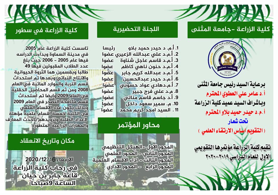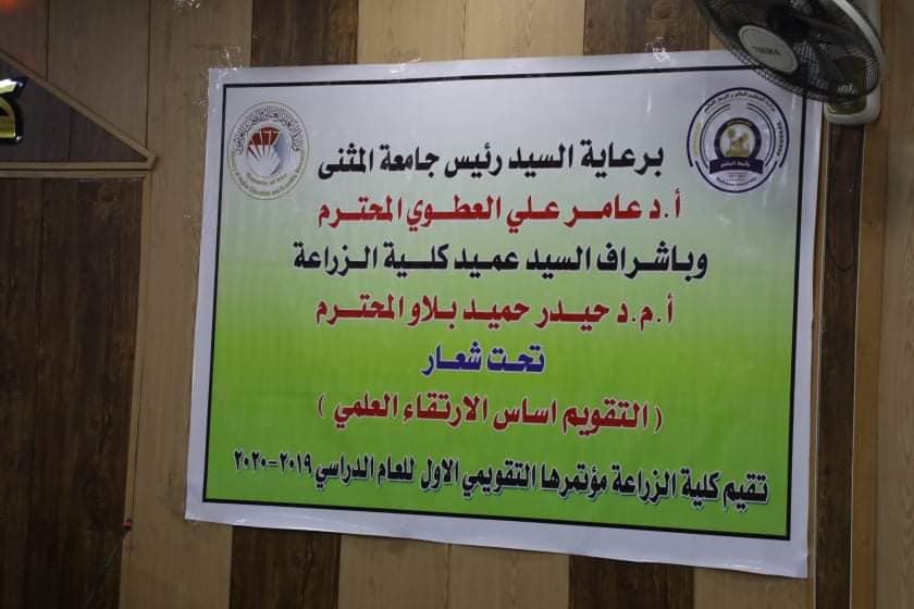 12/30/2020برعاية السيد رئيس جامعة المثنى الأستاذ الدكتور عامر علي حسين المحترم وبإشراف السيد عميد كلية الزراعة الأستاذ المساعد الدكتور حيدر حميد بلاو اقيم اليوم الأربعاء الموافق 2020/12/16 المؤتمر التقويمي الاول تحت شعار (التقويم اساس الارتقاء العلمي والإداري).