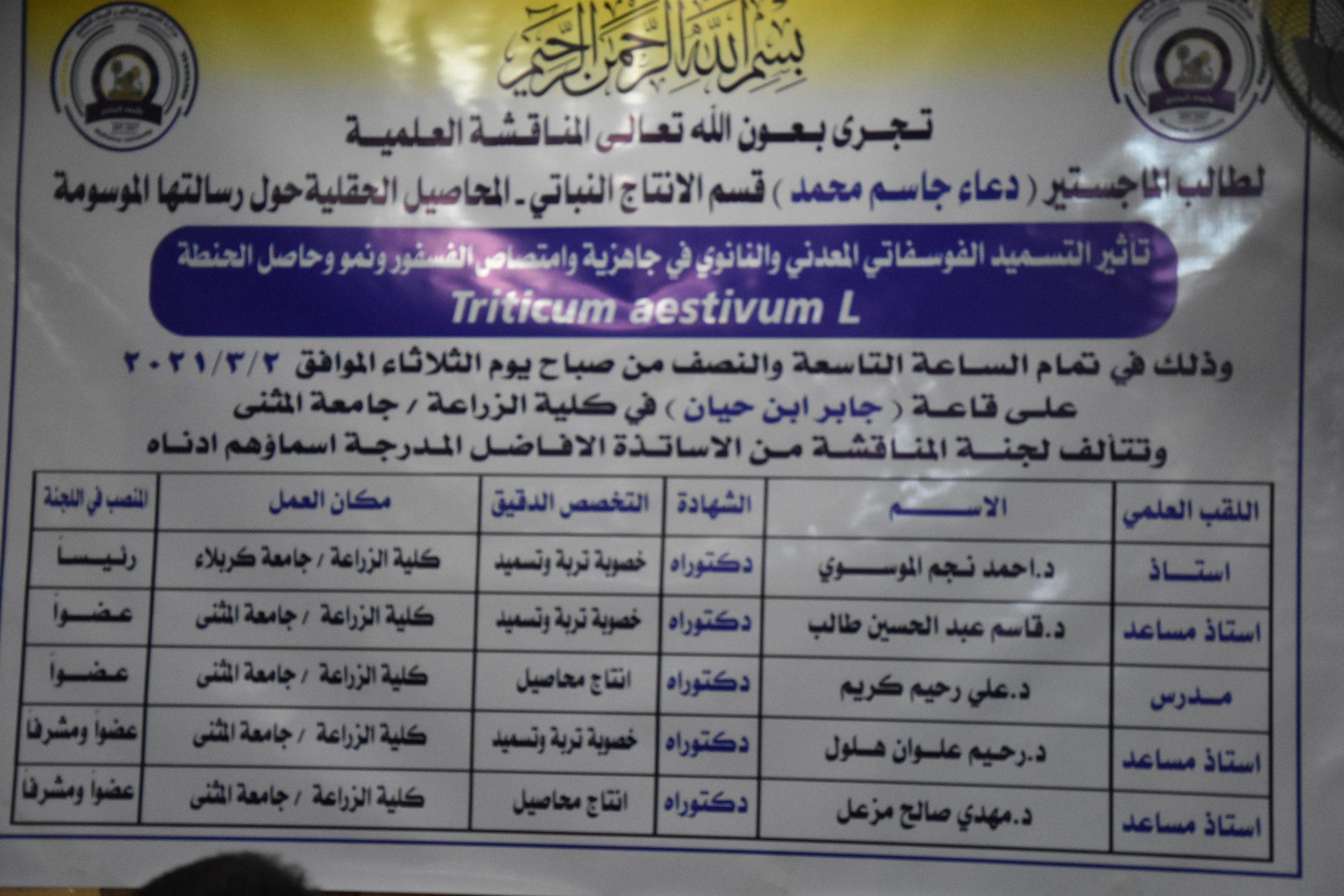 ناقشت كلية الزراعة بجامعة المثنى رسالة ماجستير للطالبه دعاء جاسم محمد /قسم الانتاج النباتي /المحاصيل الحقلية عن رسالتها الموسومة عن تاثير التسميد الفوسفاتي المعدني والنانوي في جاهزيت وامتصاص الفسفور والنمو وحاصل الحنطة Triticum Aestivum L .