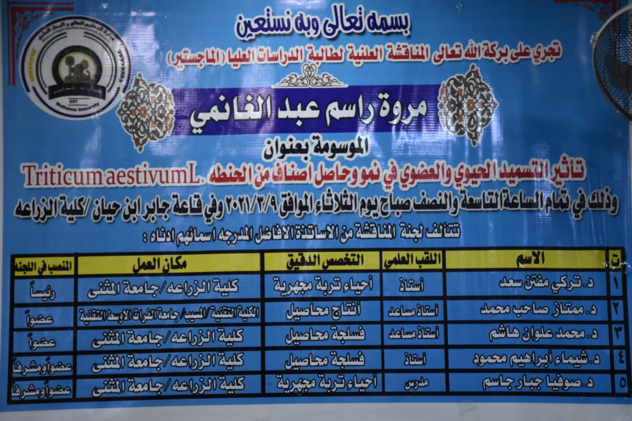 الى طلبة الدراسات العليا03/05/2021جدول الامتحانات النهائية للدراسات العليا03/10/2021 Published by at 03/09/2021 Categories الاخبار Tags تمت مناقشة رسالة الماجستير للطالبة ( مروة راسم عبدالغانمي ) الموسومة تاثير التسميد الحيوي والعضوي في نمو حاصل اصناف من الحنطة Triticum aestivuml ae في قاعة جابر ابن حيان في كلية الزراعة /جامعة المثنى .وحصلت على نتيجة امتياز اللجنة المناقشة https://agr.mu.edu.iq/wp-content/uploads/2021/03/VID-20210309-WA0022.mp4 Share0 Related posts01/20/2026اعلان دورة تدريبية – كلية الزراعة قسم المحاصيل الحقليةRead more01/20/2026رئيس جامعة المثنى يتابع الامتحانات النهايةRead more12/31/2025كلية الزراعة تتابع سير مشاريع بحوث التخرجRead more