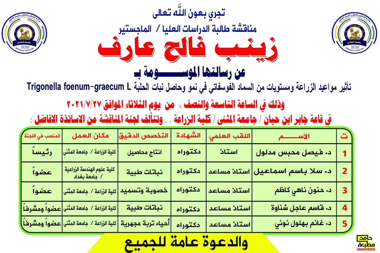انطلاق الامتحانات النهائية للفصل الدراسي الثاني للعام الدراسي 2020-2021 الحضورية والإلكترونية07/25/2021الى طلبة الدراسات العليا07/31/2021 Published by at 07/27/2021 Categories الاخبار Tags كلية الزراعة تناقش رسالة ماجستير الطالبة زينب فالح عارف الموسومة ( تاثير مواعيد الزراعة ومستويات من السماد الفوسفاتي في نمو وحاصل نبات الحلبة وحصلت على درجة امتياز فالف الف مبروك للطالبة وللمزيد من التقدم والعطاء Share0 Related posts01/20/2026اعلان دورة تدريبية – كلية الزراعة قسم المحاصيل الحقليةRead more01/20/2026رئيس جامعة المثنى يتابع الامتحانات النهايةRead more12/31/2025كلية الزراعة تتابع سير مشاريع بحوث التخرجRead more