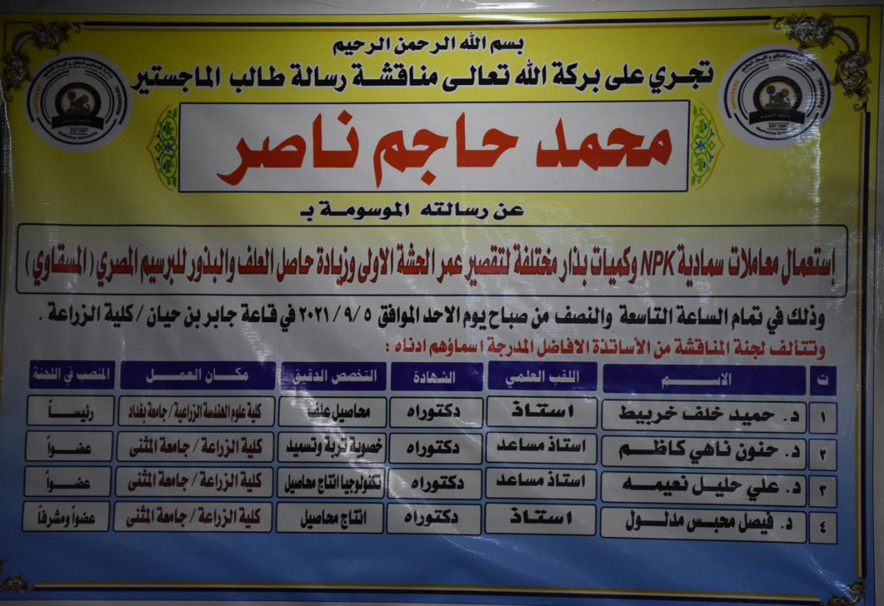 09/07/2021كلية الزراعة تناقش رسالة ماجستير للطالب محمد حاجم ناصر والموسومة ( استعمال معاملات سمادية NPK وكميات بذار مختلفة في تقصير عمر الحشة الأولى وزيادة حاصل العلف والبذور للبرسيم المصري المسقاوي)