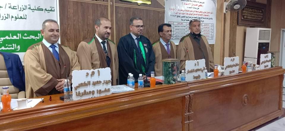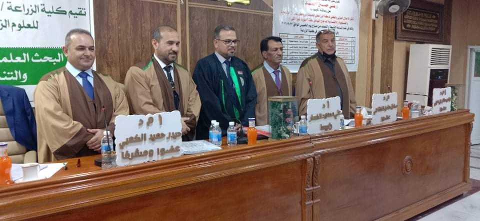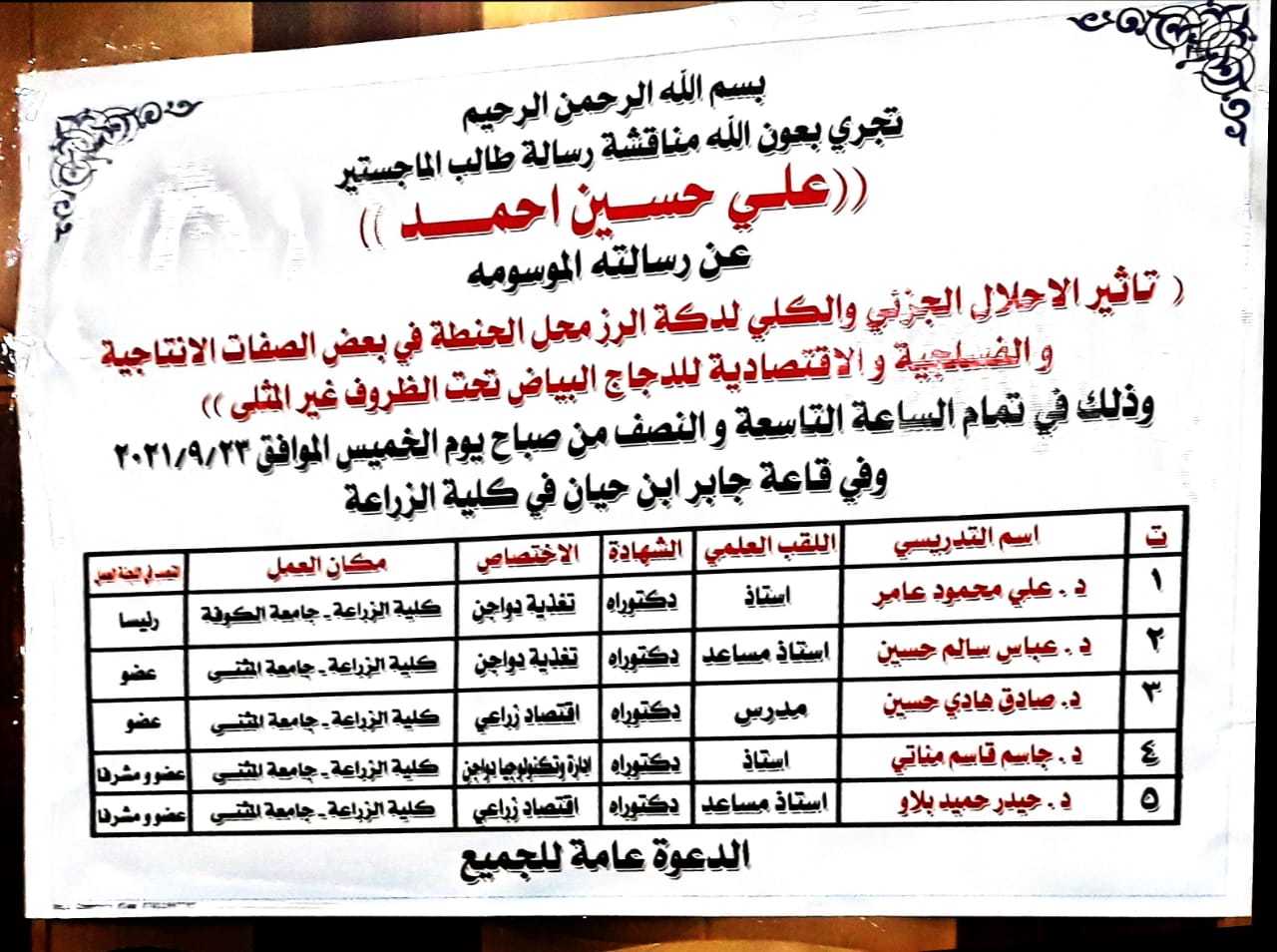 09/26/2021مناقشة رسالة ماجستير في قسم الإنتاج الحيواني للطالب علي حسين احمد والموسومة ( تأثير احلال دگة الرز محل الحنطة في عليقة الدجاج البياض على الصفات الإنتاجية والفسلجية والدمية والاقتصادية) وتالفت لجنة المناقشة من السادة