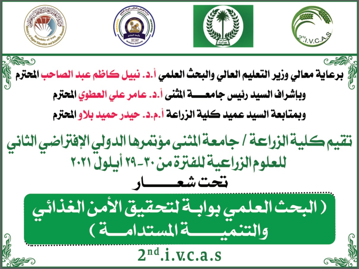 09/29/2021انطلاق فعاليات المؤتمر الدولي الزراعي يومي الأربعاء والخميس الموافق ٢٩ – ٣٠ ايلول تدعو كلية الزراعة جامعة المثنى السادة الباحثين المشتركين في مؤتمرها الافتراضي الدولي الثاني للعلوم الزراعية للمشاركة في فعاليات المؤتمر حسب المنهاج ادناه، وسيتم تزويد المشتركين من غير الباحثين بشهادة مشاركة ضمن محاور المؤتمر مقابل ٢٥ دولار،
