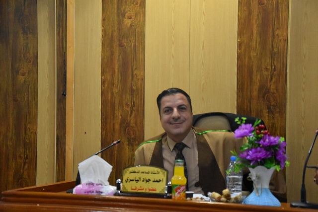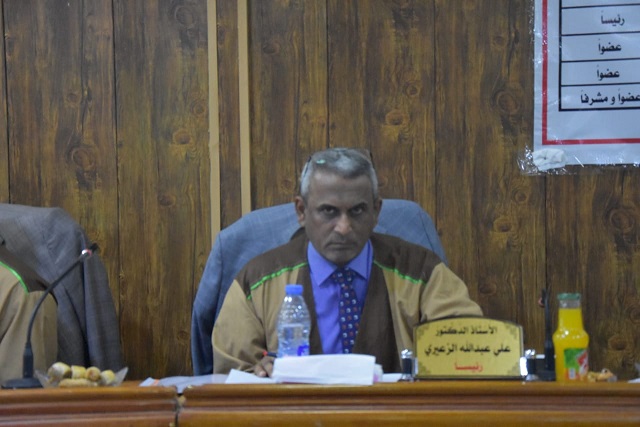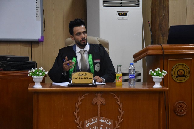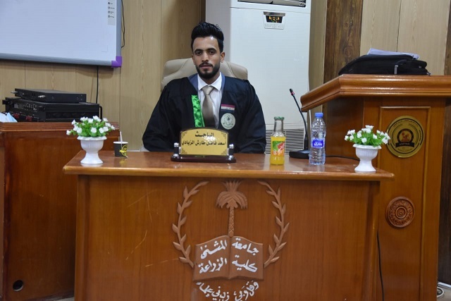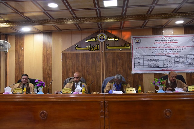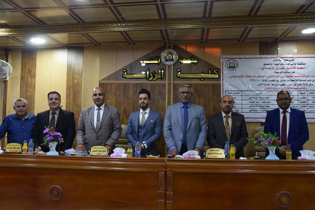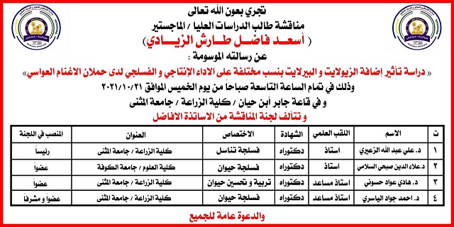 في جامعة المثنى/ كلية الزراعة/قسم الانتاج الحيواني مناقشة طالب الماجستير اسعد فاضل طارش لرسالته الموسومة ( تدراسة تاثير اضافة الزيولايت والبريلايت وخليطهما الى العليقة في بعض معايير الاداء الانتاجي والفسلجي لدى حملان الاغنام العواسي)